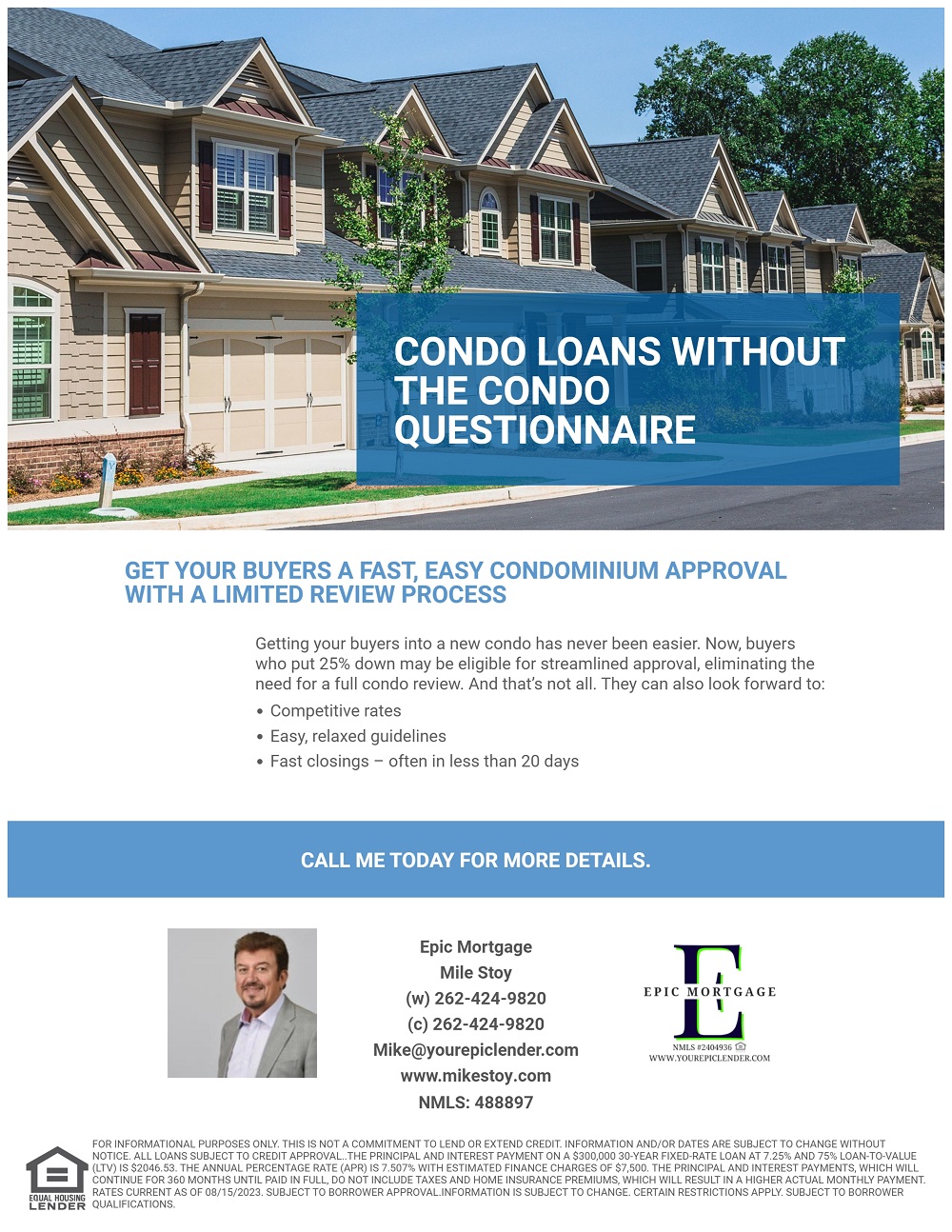 Experience is the most critical aspect when choosing the right professional to work with. With over 30 years of experience, I keep up with ever changing guidelines and help you select the correct program for your personal situation. I do this by taking the time offer program comparisons so you can make the best decision for you and your family. Furthermore, my team of highly trained operation professionals make the process seamless and stress free. When you work with Epic, you get the whole team effort to keep everything moving along according to plan. Communication is the key and we pride ourselves on top-notch communications along the way. I have dozens of handpicked investors and lenders so I can shop for you to obtain the best possible program with a fantastic rate that fits your needs. The educational process continues with suggested and at times required Homebuyer Education. I walk with you step by step throughout the process. Once my clients are approved, I help them with the buying process along with their Real Estate Agent or can recommend a great one to work with.